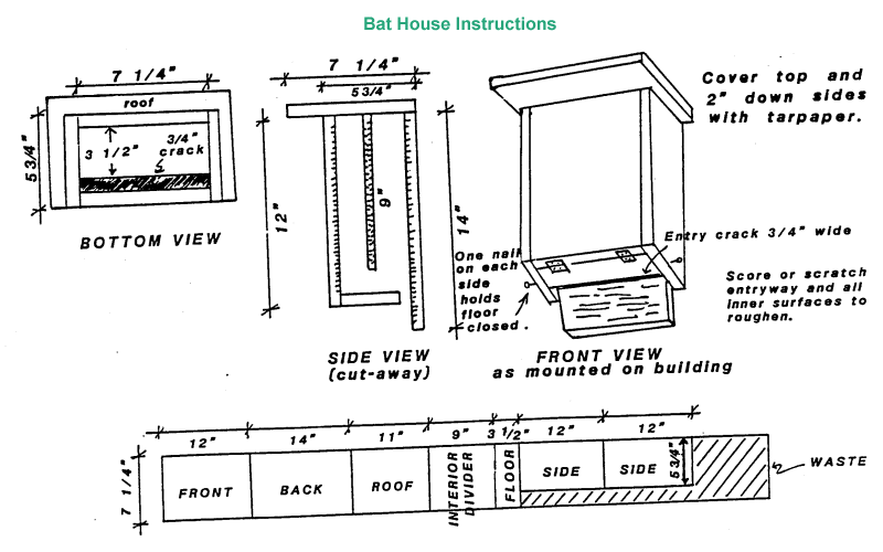 To build a bat house from wood, refer to the diagram and directions above. Entry space should be about 3/4 inch wide, and all inner surfaces must be roughened to allow bats to climb on them with ease. Screen mesh also works well.