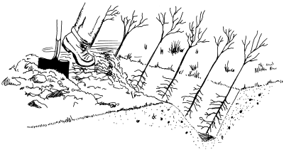 How stock is handled at the nursery and in transit often determines its health. Signs of mishandling include dry roots, white-tipped roots, excess soil on the roots, swollen or burst buds, presence of mold on needles or stems, broken stems or stripped roots, and containers that are ripped or crushed. Bare-root plants, regardless of whether they are seedlings or transplants, need to be kept moist before and during planting. Keep the shipping package moist or place the plants in a pail with an inch or two of water (over-watering can kill the plants). The best option is to mix peat moss, dirt, and water in a pail to make a slurry. Put the little trees or shrubs in the slurry and keep them in a cool place (35 degrees Farenheit if possible) until you are ready to plant, which should be within 48 hours. Plants sold in containers should have soil and roots joined tightly. Pruned roots should be cut cleanly and be no wider than an average finger. Check for the absence of large, circling roots by feeling down into the top 3 or 4 inches of the pot. Stock that has been balled and burlapped should have a firm root ball near the trunk. Size of the ball should be about 1 foot for each inch of trunk diameter. Planting TechniquesIt is best to plant in early spring or late fall when the plants are dormant. However, in heavy soils such as clay, planting in fall is discouraged as the plants may be frost heaved from the ground before roots can become established. When planting, keep the young plants moist and out of direct sun, if possible. If the roots of the trees were not pruned to an eight-inch length at the nursery, do so with clippers or a sharp ax. Root pruning makes planting easier and increases survival rates. The depth of the planting hole and length of roots should be about the same but not less than 8 inches, and the root collar (small swelling where the ground level was at the nursery) should be an inch deeper than the new surface. When planting bare root stock by hand, use a shovel to dig a hole large enough to spread the roots in a natural, uncrowded way, add soil around the roots to the root collar, and tap firmly to exclude air. You can also use a planting bar, or dibble, to make a vertical slit in the soil and to repack the soil around the tree after planting. Be careful not to crowd the roots, and make sure the soil is firmly replaced. If possible, water the trees after planting. When planting trees and shrubs with soil attached by hand, slope the sides of the hole away from the plant and dig or deeply rototill to a depth of 12 inches around the hole. Before placing plants in the hole, loosen the roots from the soil. This extra preparation will lessen the shock of transplant and give roots a chance to spread in a wide periphery while in softer soil. How wide an area to dig depends upon the amount of space available, whether roots of other trees will be damaged, and soil compaction (the more dense the soil, the wider the area). The usual range to consider is two to five times the diameter of the root ball. Wet the bottom of the hole before planting, place the tree or shrub upright, pack soil firmly, and water if possible. Planting machines are usually used when planting large numbers of trees or shrubs. Bare root stock is usually used. The planting machine makes a slit in the soil where the operator places the tree. The machine then closes the slit and packs soil around the roots. Typically pulled behind a tractor, some planting implements have a furrowing attachment to clear away debris and vegetation. Others have spray attachments for applying herbicide. Check with your county Conservation District office or nursery for availability. One person can plant 40 to 60 trees or shrubs per hour by hand or 200 to 300 per hour with a machine planter. Hand planting may be the only method on steep or rough terrain, and it is better for walnut and various oaks, which have long taproots. If you are planting conifers, the typical rate is 600 to 1,000 trees per acre. Hardwoods are typically planted at 300 to 500 trees per acre. Windbreaks of hardwoods and/or conifers should have at least three staggered rows. Tree spacing to reach these recommended densities is included in the accompanying panel. Do not plant stems and rows too close together. Eight to 10 feet apart is usually sufficient. This may look like a long way when the stems are 10 inches tall, but when they are eight feet tall you will know why you should plant them with ample space.