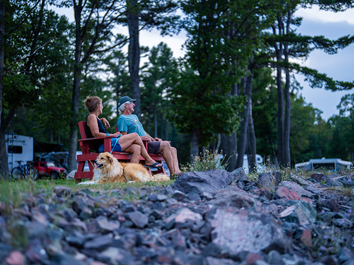 12/14/2023 12:31 PM 470346 two_campers_sitting_on_bench_with_dog_in_campground.jpg