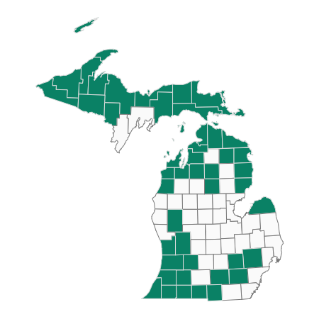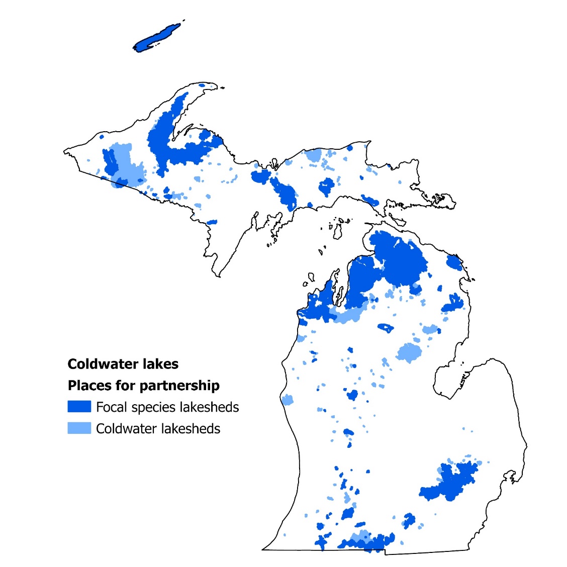 Coldwater inland lakes are unique, high quality and relatively fragile resources that are characterized as cold and deep with exceptional water quality, allowing them to support species that other lakes cannot support. Among the many obligate coldwater species in Michigan’s inland lakes, there is one Threatened fish species: cisco. Of the over 11,000 inland lakes in Michigan, fewer than 200 support populations of this rare gamefish. Cisco are a species in the whitefish family and require clean, cold, well-oxygenated waters. Their narrow habitat requirements make cisco sentinels of lake quality and indicators of habitat degradation. In this plan, coldwater inland lakes include those that support cisco, have predicted or measured suitable coldwater habitat (Hansen et al. 2022), support lake whitefish, or are managed for trout species. Coldwater inland lakes are distributed statewide. There are high concentrations of these lakes in the counties adjacent to the Great Lakes and in southern Michigan’s interlobate regions, which are places where the edges of two glacial moraines came near one another and deposited large amounts of glacial debris. Coldwater inland lakes vary in size, with most between 10 – 600 acres and some over 18,000 acres.